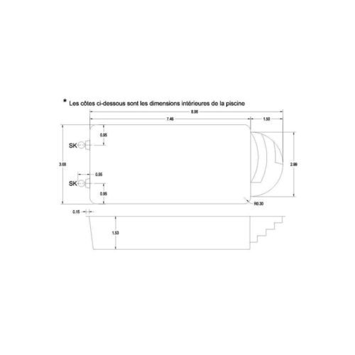 Ces modèles possèdent un large escalier pouvant recevoir nage à contre courant, balnéo, aérothérapie et toutes options. Possibilité de poser un volet hors sol. Rebord polyester renforçé assurant une grande rigidité.